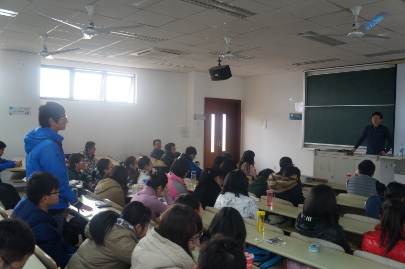 唐赟以幽默风趣的方式向同学们介绍了国外大学生活、参加交流项目的条件以及所需要的花费,提醒有出国意向的同学要关注学校的发文,并提前做好相关准备。