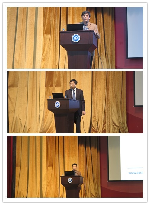 图片说明:校长助理宋恭华、国药奇贝德工程技术有限公司院长王云宝及香港奥星集团副总经理马义岭分别致辞