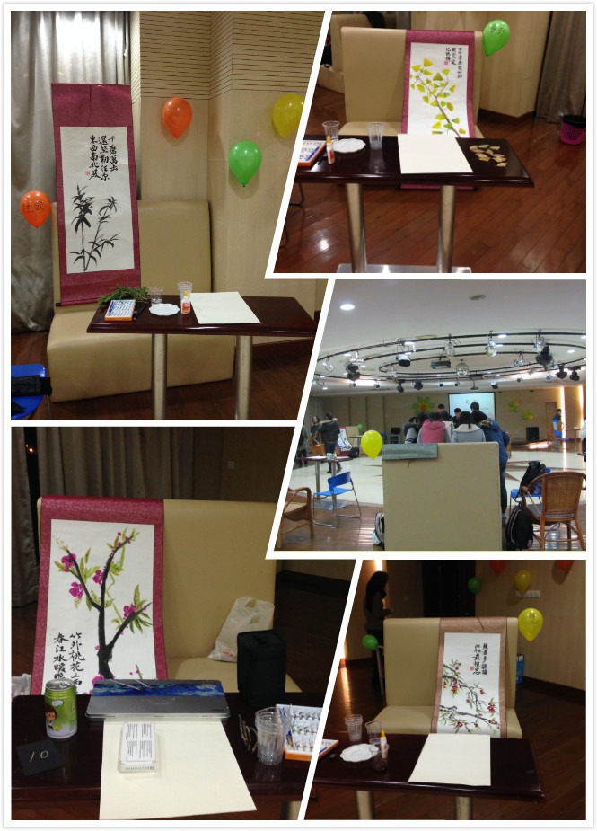活动现场的布置很是考究,一幅幅字画卷轴将现场的古风古韵烘托至极致,创作台上品种繁多的植物实体诠释着它们各自独特的精神内涵,舞台中央天马行空的创意材料又将90后“鬼才”呈现得淋漓尽致,让人一进场就有一种想要立刻投入创作的冲动。为了给同学们更多创作时间,主办方精简了活动流程,待主持人简单介绍活动背景、目的及规则后,各队即根据自己在11月27日晚抽签决定的古诗词,结合预先的构思,借助现场的材料,在规定时间内,围绕相关咏物古诗词意境,完成了一副副精美的作品。