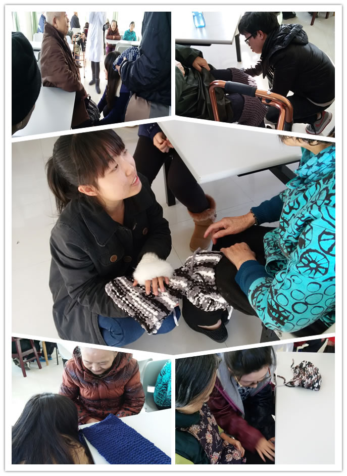 支部成员们组织学院党员及积极分子,利用课余时间学习编织,亲手为老人们编织护膝及护腕,给爷爷奶奶们送去温暖。活动现场,学生们蹲下身子,亲手为老人们系上护膝,这小小的举动让有些老人当场感动落泪。尽管大家在语言上存在沟通障碍,但老人们始终紧紧地握着同学们的手。党支部的同学还特意为老人们准备了才艺表演和一些日常保健护理的小贴士。