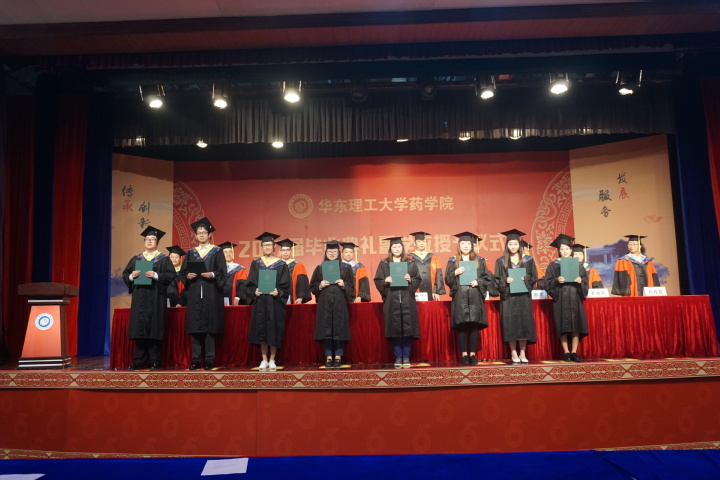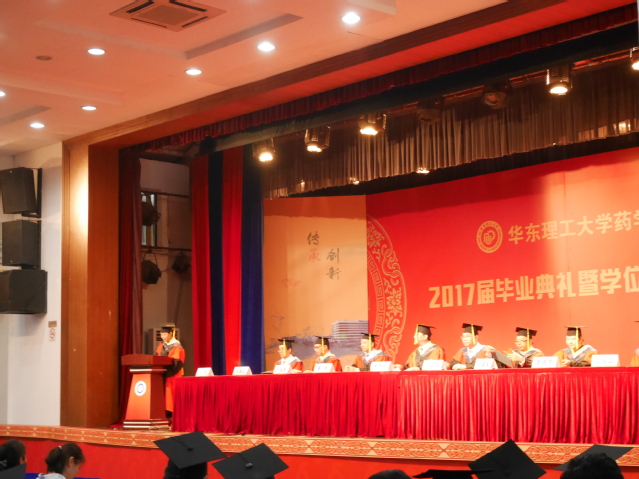 院长宋恭华、党委书记李剑,副院长邓卫平、任国宾,院长助理罗晓燕,药物科学系系主任刘桂霞、制药工程系系主任任褔正,以及叶金星教授为毕业生颁发学位证书并拨穗正冠。学院教师代表、学生家长和2017届本硕毕业生共同见证了这一难忘时刻。毕业典礼由学院党委副书记王越主持。
