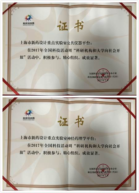 上海市新药设计重点实验室“公共仪器平台”及“神经药理学平台”在2017年全国科技活动周“科研机构和大学向社会开放”活动中,积极参与,精心组织,成效显著,经推荐评选,受到了全国科技活动周组委会(科技部政策法规与监督司)的表彰与嘉奖。