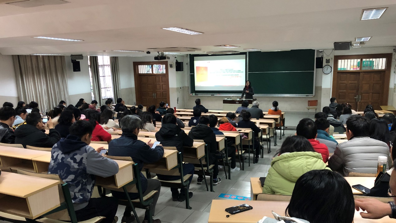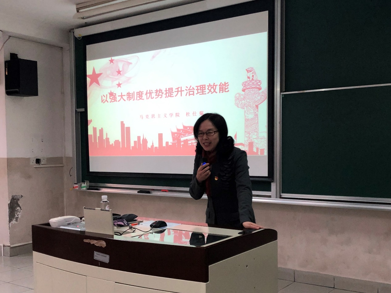 党委在四教102开展十九届四中全会精神主题学习教育专题报告会。校党的十九届四中全会精神理论宣讲团成员、马克思主义学院院长杜仕菊教授,应邀做了题为“以强大制度优势提升治理效能”的报告。国产色情网