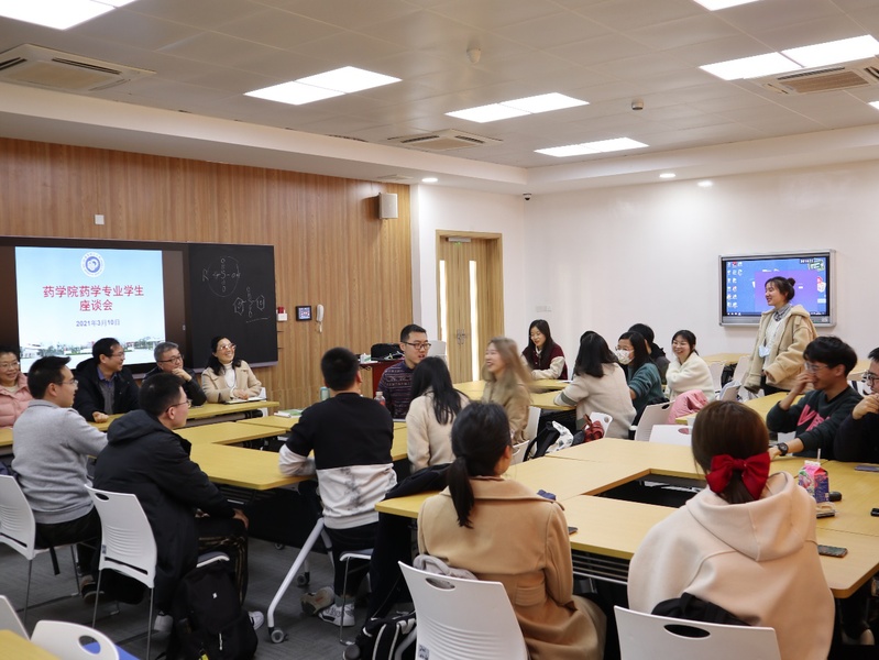 张青书记、副院长药学专业责任教授邓卫平、院长助理马磊、药物科学系主任刘桂霞、以及副主任郑文云和班导师代表参加了此次座谈会。座谈会上,学生积极发言,就专业学习和未来发展等问题提出了很多意见和建议,包含学生就业指导,社会实践,大学生创新实践的选题,以及大类基础课程(数学、物理)的学分设置偏高,实验课程与理论课程不够对接等,同时也对毕业论文的完成、课程设置以及修读指导,企业实习实践等提出很好的建议。针对这些问题和建议,在场的老师们从各自不同的角度作了回应和解读,最后,张青讲话,她感谢同学们提出宝贵意见建议,表示学院高度重视国家一流本科专业建设,以立德树人为根本,不断深化教学改革,服务学生成长成才。她还与毕业班同学就毕业求职、学院就业工作等方面进行了交流。