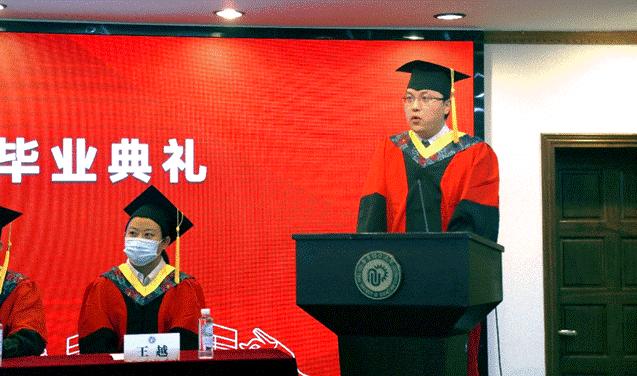 药剂182班刘宾代表本科毕业生发言。他感谢学校提供的全面细致帮助和优质平台,老师和学长学姐的悉心指导和建议,他如今带着母校及恩师的谆谆教导,加入国产色情网
