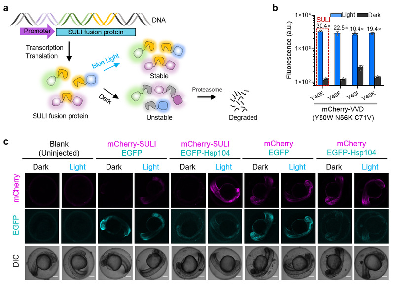 在本研究中,研究团队基于光敏蛋白VVD发展了光诱导稳定的蛋白质降解标签SULI(stabilization upon light induction)。在黑暗条件下,SULI标签会被细胞的降解系统识别并降解;在蓝光照射下,SULI标签则非常稳定。实验结果表明,SULI可被用于调控多种报告蛋白的稳定性。更重要的是,SULI可插入在目的蛋白的N端、C端甚至是内部来调控它们的稳定性。进一步研究结果表明,SULI对目的蛋白的降解是光强依赖的,并且可以震荡式调控目的蛋白在细胞中的丰度。本研究还研究了SULI介导蛋白质降解的分子机制。结果表明,SULI是通过非赖氨酸泛素化依赖的蛋白酶体途径降解的,并且还伴随有聚集与去聚集过程。研究团队利用显微成像实验证明SULI在其降解过程中会发生聚集,并在Hsp104蛋白的辅助下完成去聚集并进入蛋白酶体完成降解过程。本研究随后利用SULI调控酵母细胞内源蛋白SicI的稳定性,实现酵母细胞周期的精确控制。此外,SULI还可用于调控斑马鱼中蛋白质的稳定性,通过对Pitx2蛋白稳定性的调控,本研究实现斑马鱼发育过程的精确控制。综上,SULI为研究不同细胞过程中的蛋白质代谢和功能提供了一个强大而方便的工具。