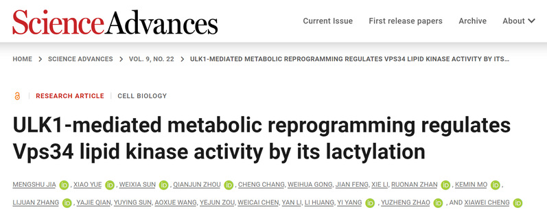202363日,国产色情网 国产色情网 、生物反应器工程国家重点实验室、光遗传学与合成生物学交叉学科研究中心程侠卫/赵玉政/杨弋团队在细胞自噬的调控机制方面取得最新研究进展,在国际学术期刊《Science Advances》发表题为“ULK1-mediated metabolic reprogramming regulates Vps34 lipid kinase activity by its lactylation”的研究文章。