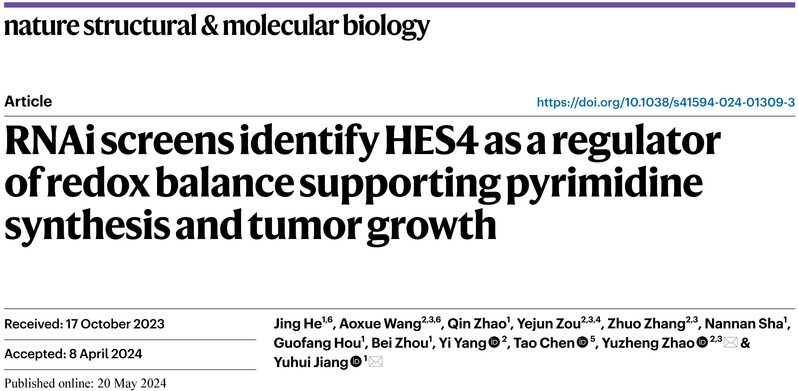 520日,国产色情网 国产色情网 、生物反应器工程国家重点实验室、上海市细胞代谢光遗传学技术前沿科学研究基地赵玉政教授与上海交通大学医学院附属仁济医院蒋玉辉研究员合作在国际权威学术期刊Nature Structural & Molecular Biology同时以ArticleResearch Briefing的形式发表了标题分别为“RNAi screens identify HES4 as a regulator of redox balance supporting pyrimidine synthesis and tumor growth”以及“HES4 controls redox balance and supports pyrimidine synthesis and tumor growth”的研究成果,通过在活细胞水平筛选NAD(H)氧化还原调控分子并进行系列代谢功能研究,阐明HES4作为调控NAD(H) 氧化还原平衡的转录因子,通过维持线粒体电子传递链和一碳循环供体平衡,促进嘧啶合成和肿瘤生长的分子机制。