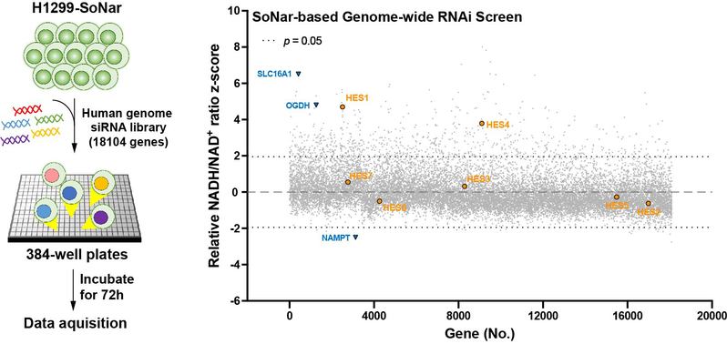 为了在基因组尺度系统性地刻画细胞氧化还原调控网络,研究人员首先利用能够识别NAD(H)及反映NADH/NAD+比率的高敏探针 SoNar,并结合siRNA文库首次在活细胞内进行了全基因组的NAD(H) 氧化还原平衡调控因子筛选(1),发现HES4作为高分候选分子对NADH/NAD+比率起到负向调控作用,其暗示HES4功能与细胞代谢活性密切相关。