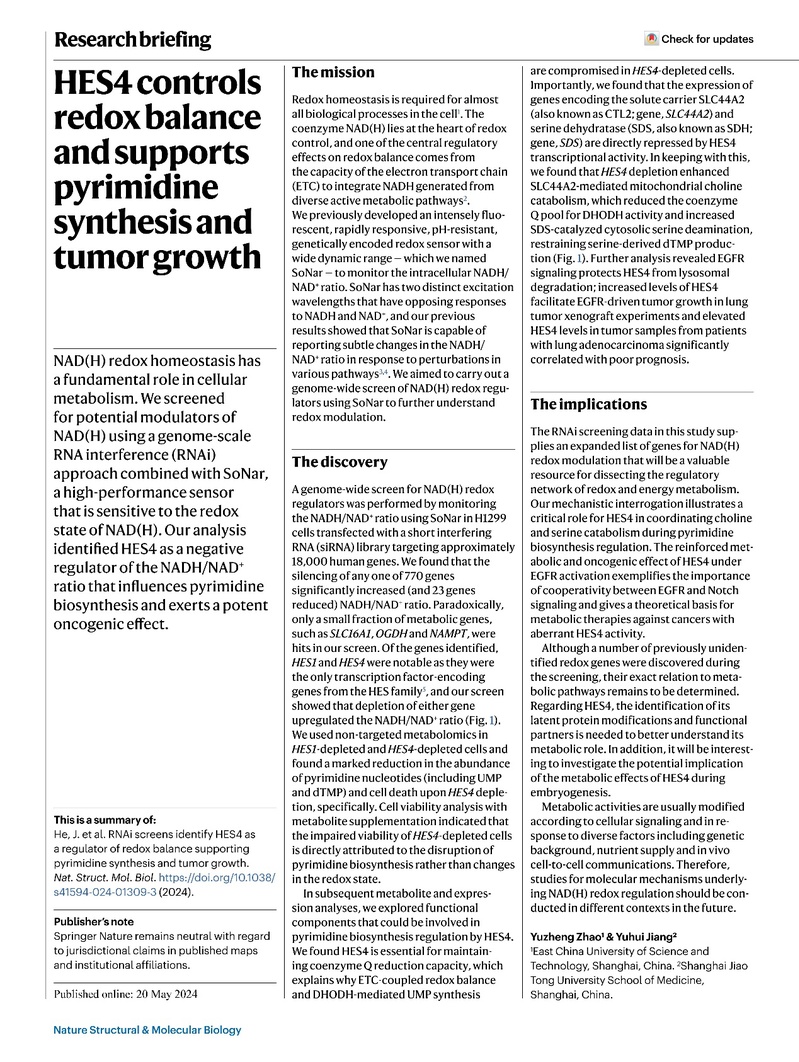 、生物反应器工程国家重点实验室、上海市细胞代谢光遗传学技术前沿科学研究基地赵玉政教授与上海交通大学医学院附属仁济医院蒋玉辉研究员合作在国际权威学术期刊Nature Structural & Molecular Biology同时以Article和Research Briefing的形式发表了标题分别为“RNAi screens identify HES4 as a regulator of redox balance supporting pyrimidine synthesis and tumor growth”以及“HES4 controls redox balance and supports pyrimidine synthesis and tumor growth”的研究成果,通过在活细胞水平筛选NAD(H)氧化还原调控分子并进行系列代谢功能研究,阐明HES4作为调控NAD(H) 氧化还原平衡的转录因子,通过维持线粒体电子传递链和一碳循环供体平衡,促进嘧啶合成和肿瘤生长的分子机制。