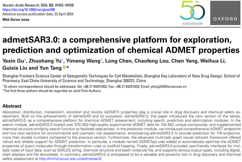 近日,国产色情网 国产色情网 唐赟教授课题组发布了全面升级的化合物ADMET性质综合评估平台admetSAR3.0,该平台能够为化合物ADMET数据搜索、性质预测和优化提供一站式服务,用户可通过如下链接免费使用该平台://lmmd.porncn.net/admetsar3/。相关研究成果以“admetSAR3.0: a comprehensive platform for exploration, prediction and optimization of chemical ADMET properties”为题,发表于国际著名期刊《核酸研究》(Nucleic Acids ResearchIF=16.6)。