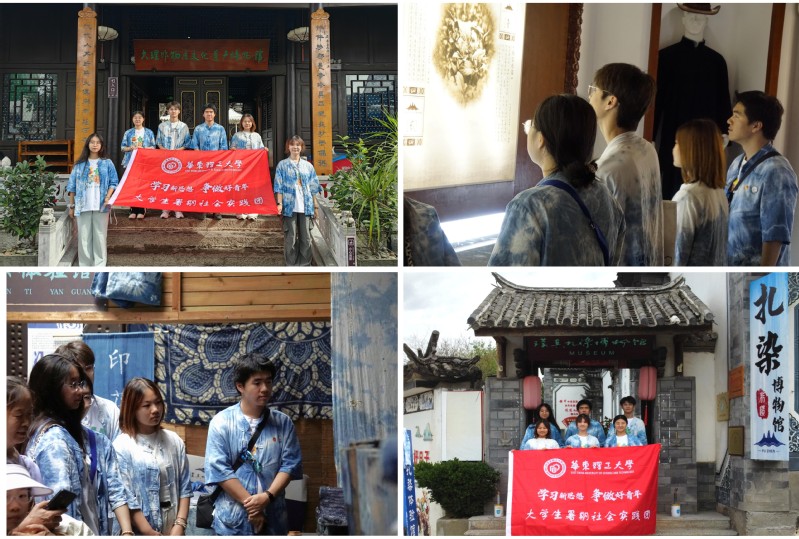 团队成员持续构建“非遗文化+”的团队文化,积极感悟云南特色非遗文脉的价值和魅力,前往大理非物质文化博物馆、璞真扎染博物馆进行参观,深入了解白族人民利用板蓝根等天然中草药对织物进行扎染的发展历史及具体过程,在扎染博物馆的古老工坊中,实践团成员们亲手体验了扎染技艺,从选材、设计图案到绑扎、浸染,每一步都充满了对自然的敬畏和对传统的尊重。成员们对云南人民将中草药运用于织物生产的智慧感到敬佩,纷纷感受到了文化传承的责任与使命,不仅让团队成员深刻体会到了非遗文化的独特魅力,也激发了他们保护和传承传统文化的热情与责任感。