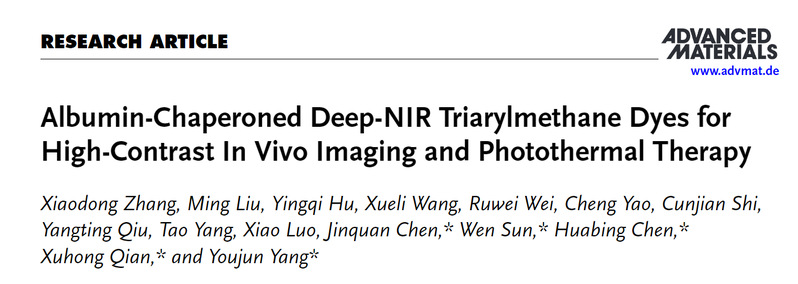钱旭红院士、杨有军教授团队设计并两步合成具有“螺旋桨构型”的深近红外三芳基甲烷衍生物(EA5系列染料)。利用生物内源性白蛋白对EA5染料进行包封极大地提高了染料的荧光亮度,并解决了大多数近红外染料面临的合成步骤冗长、生物兼容性差、热力学稳定性差和水溶性差的难题。相关成果以“Albumin-ChaperonedDeep-NIR Triarylmethane Dyes for High-Contrast In Vivo Imaging and Photothermal Therapy”为题发表在Advanced Materials(Adv. Mater.2024, 2411515)上。