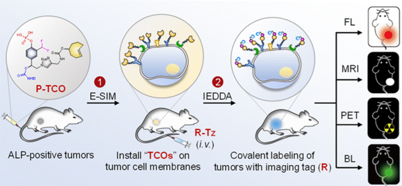 此外,谢贺新教授课题组与南京大学叶德举教授团队、江苏省原子医学研究所林建国研究员团队合作,在预靶向多模态活体动物肿瘤成像取得最新进展,相关成果以“Pretargeted Multimodal Tumor Imaging by Enzymatic Self-Immobilization Labeling and Bioorthogonal Reaction”为题发表在Journal of the American Chemical Society。该研究以研究团队前期发展的碱性磷酸酶自锚定探针(Chem. Eur. J. 2019, 25, 13994)为预靶向基团,通过亚甲基苯醌中间体的形成将反式环辛烯(TCO)选择性共价标记在活体动物肿瘤细胞膜上,进而通过快速的生物正交反应,将含有四嗪的各种信号报告基团(如荧光染料、磁纳米粒子、放射性核素、生物发光蛋白等)选择性富集在肿瘤细胞中,从而实现对活体小鼠肿瘤的高灵敏荧光、核磁共振、正电子发射断层及生物发光等多模态成像。南京大学博士研究生缪银杏、副研究员王宇琦、国产色情网