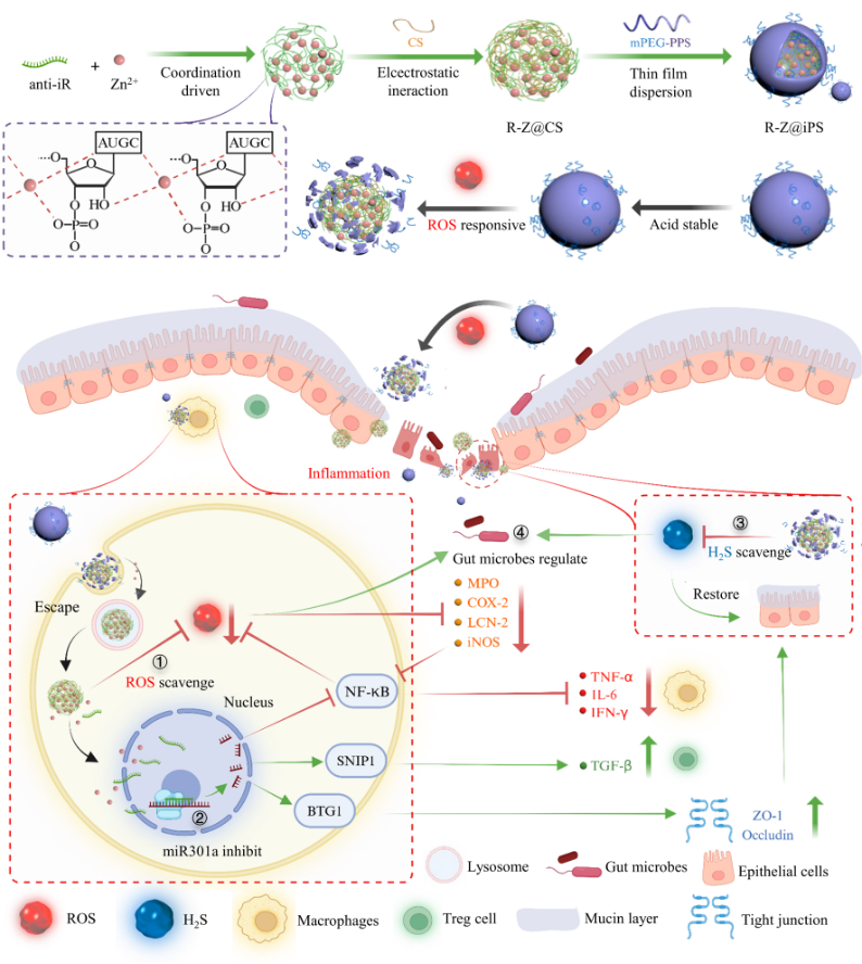 近日,国产色情网 国产色情网 高峰教授课题组又有新突破,首次提出一种能有效调控炎症结肠部位ROS和H2S等自由基水平的反义寡核苷酸和锌配位的纳米酶。同时,本研究在前期金属基配位靶向纳米递药平台设计策略,配位机制和构建研究的基础上(Asian J. Pharm. Sci.,2024,19,100858;Adv. Healthc. Mater.,2024,2024,2401869;ACS Appl. Mater. Interfaces,2025,17,617),首次将上述锌基配位纳米酶,联合壳聚糖和PEG修饰的聚丙烯硫醚[PEG-poly(propylenesulfide),PEG-PPS]组成的ROS响应杂合脂质纳米递药平台,用于同时实现anti-miR-301a的口服递送,自由基-炎症通路调节,肠道屏障和菌群恢复等多重功能,从而实现IBD的有效治疗。相关研究对反义寡核苷酸的口服递送以及IBD的微环境调控均具有重要价值。相关成果以“An anti-miR-301a and zinc coordination driven nanozyme loaded in nanoparticle for oral therapy of inflammatory bowel disease based on colitis microenvironment regulation”为题发表在国际权威学术期刊Chemical Engineering Journal上。国产色情网 博士研究生邹佳峰、硕士研究生夏传河为该论文共同第一作者,高峰为论文通讯作者。