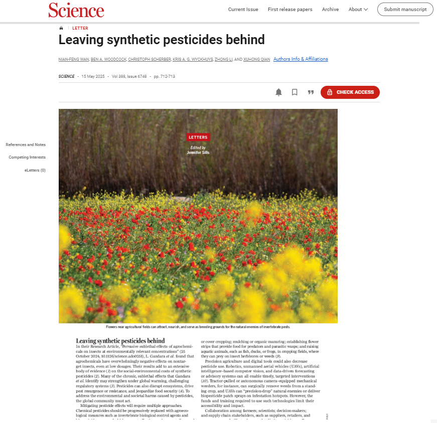 钱旭红院士团队的万年峰教授联合华东师范大学等中英德澳的科研人员,在国际顶尖综合性期刊Science上以Letter形式发表了题为“Leaving synthetic pesticides behind”的学术论文。