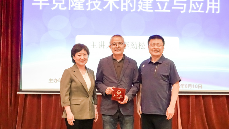 王慧锋与张立新为李劲松院士颁发生物反应器工程全国重点实验室“俊棠论坛”纪念章。