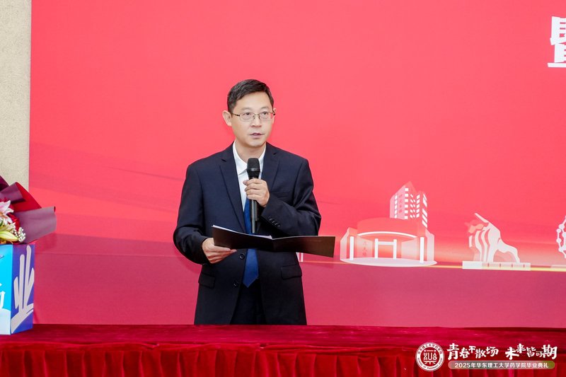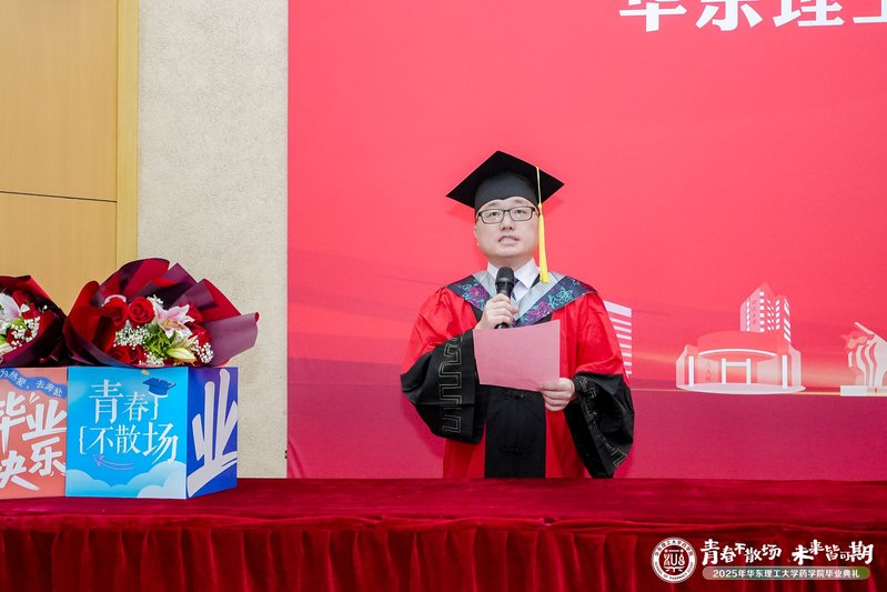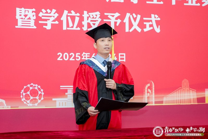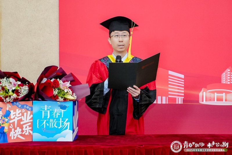 教授赵建宏作为教师代表发言。他表示今年是他从华理本科毕业的第30年。30年来,他在绿色制药领域取得了丰硕的成果,这些成就离不开母校的栽培。他寄语毕业生们要感恩母校,牢记“勤奋求实,励志明德”的校训精神,为我国医药事业做出更大贡献。