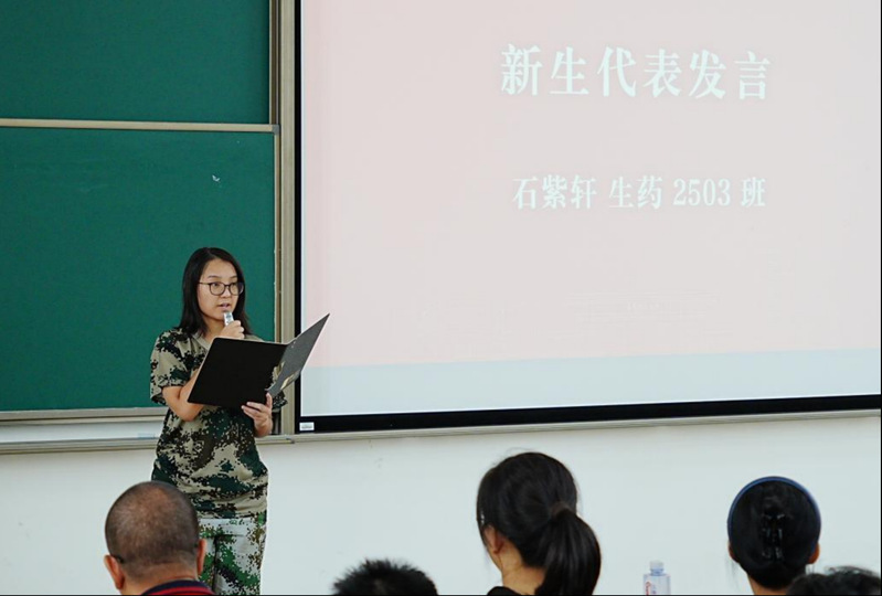 2025级生药试验专业本科生石紫轩同学,作为新生代表发言。她表示,希望能在大学期间探索医药奥秘、锤炼实践能力,以“勤奋求实,励志明德”的校训为指引,扎实钻研专业知识、立牢报国之志;以“良药苦口、忠言逆耳”的院训为准则,始终虚心求学、精进本领,努力把个人奋斗融入国家医药行业发展浪潮,为守护人类健康贡献青春力量。
