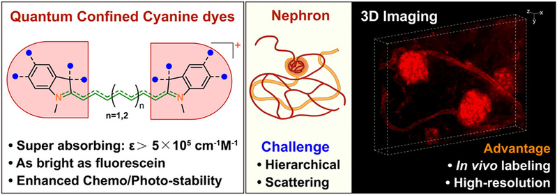 钱旭红院士、杨有军教授团队构建了基于“电场量子限域效应”的超吸收花菁染料。该研究工作提出了一种用于提升染料摩尔消光系数的理性设计方法,对Cy3/5/7/9四个系列的染料进行合理分子改造,成功构建一个摩尔消光系数高(亮度高)、稳定性好的花菁染料库,并成功实现小鼠肾脏组织高精度三维成像。相关成果以“Super-Absorbing Quantum-Confined Cyanine Dyes for Near-Infrared Confocal Imaging of Hierarchical Nephron Structures”为题发表在J. Am. Chem. Soc.(//doi.org/10.1021/jacs.5c13660)上。